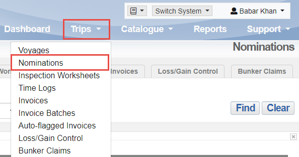 1. From the Dashboard, navigate to the Trips menu and click on the Nominations page: