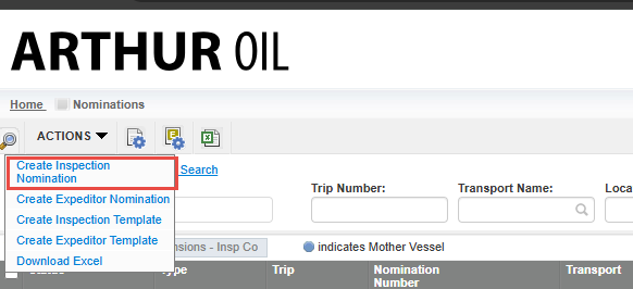 2. On the Nomination view all page, click the Action menu tab, and select "Create Inspection Nomination"