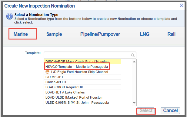 3. Select the type of nomination, or select a nomination template and click "Select"